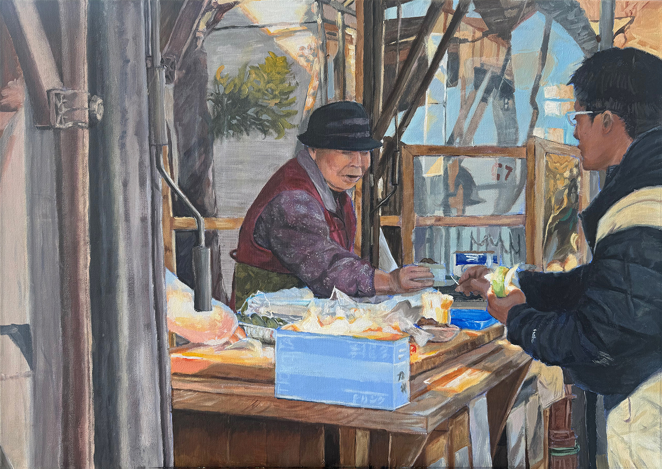 This painting captures a heartfelt scene of a Singaporean grandmother in Japan, preserving her roots by preparing and sharing traditional food. Her humble market stall becomes a symbol of resilience, connection, and identity. Though far from home, her warmth and dedication reflect the community spirit at the heart of Singaporean culture. The artwork evokes nostalgia and highlights the enduring bonds overseas Singaporeans maintain with their heritage. More than just food, it celebrates the love, memories, and traditions carried across borders — a touching tribute to the strength of cultural identity and the comfort of familiarity in a foreign land.