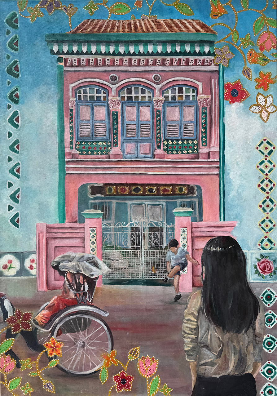I hope to capture the enduring spirit of Singapore through my artwork. In the painting, a modern-day girl gazes at an old Peranakan shophouse, a rickshaw puller, and a boy playing chapteh. Through her eyes, viewers are invited to step into the past and imagine what life was like, and how these layers of history continue to shape our present. I’ve also included the iconic batik motifs from Singapore Airlines as a tribute to its timeless elegance and national pride. The vibrant colours hint that even in the 1920s, life pulsed with colour and joy.